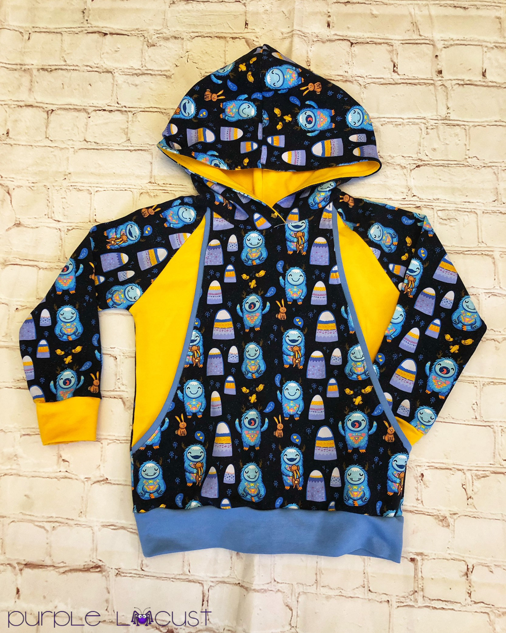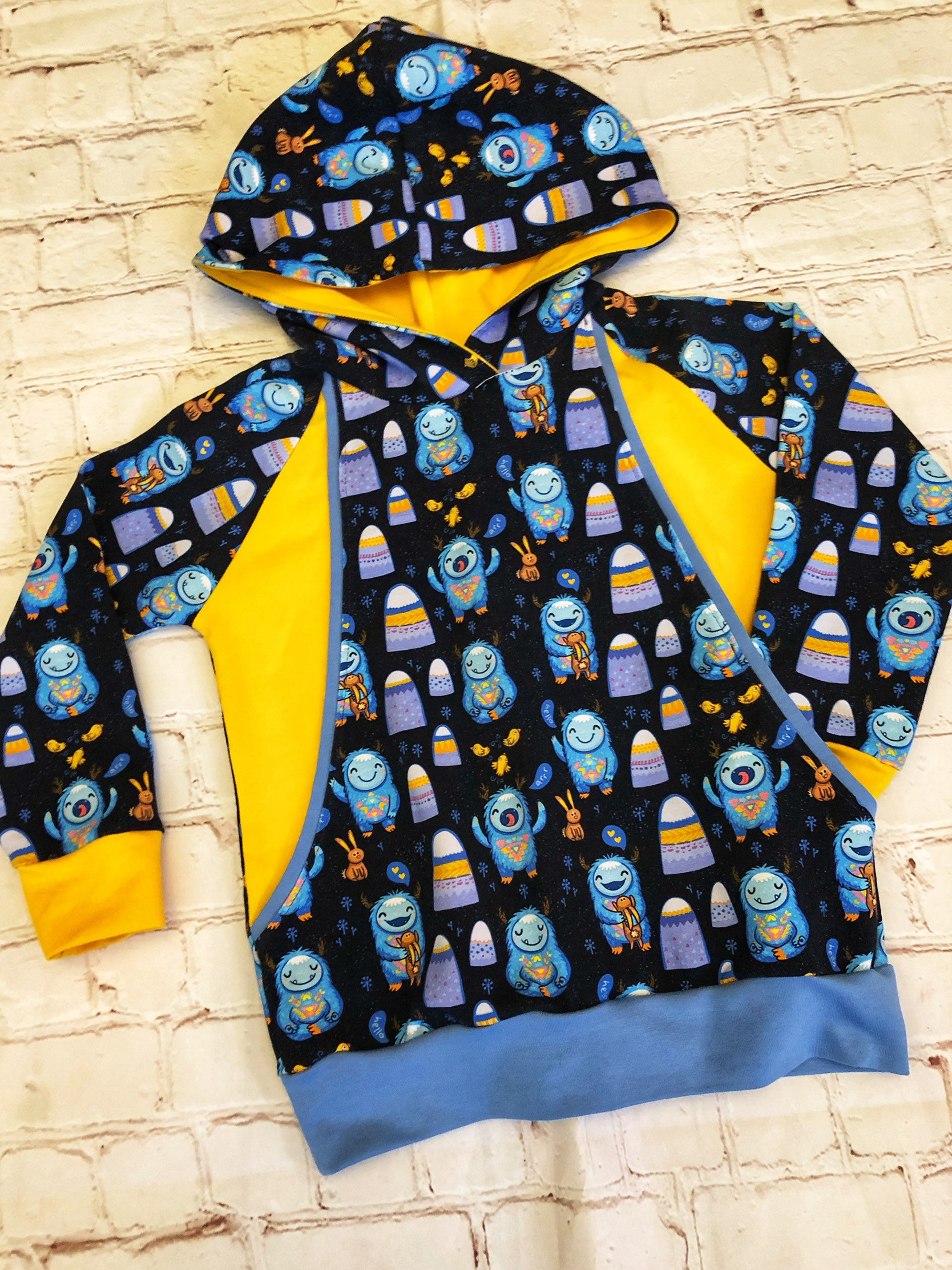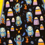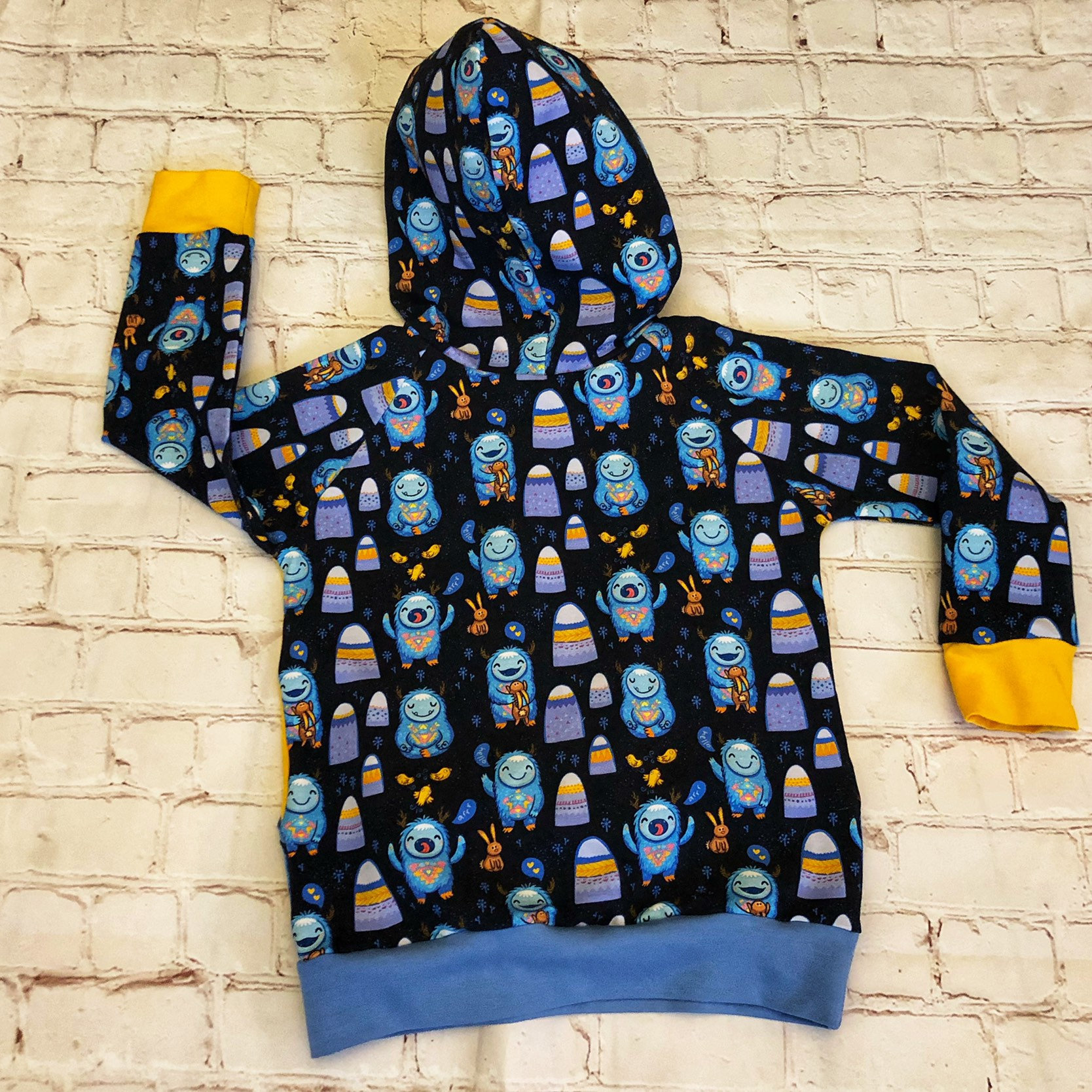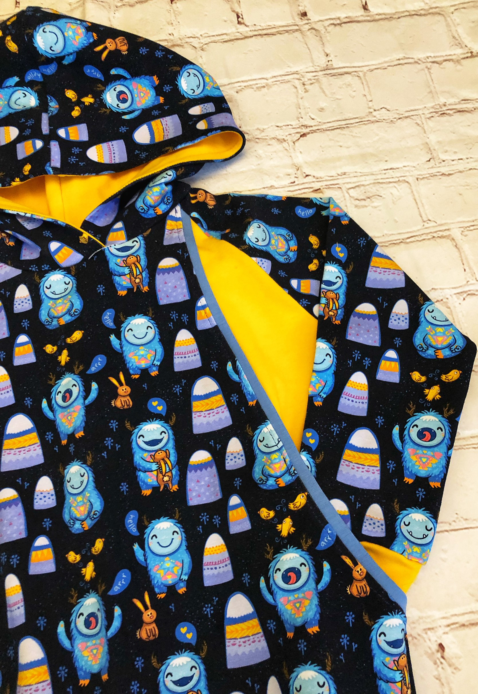 Made from soft cotton lycra, ideal for cooler days. The main fabric has yeti monsters on a black background. It is lined with yellow jersey fabric with lighter blue cuffs and waistband.
